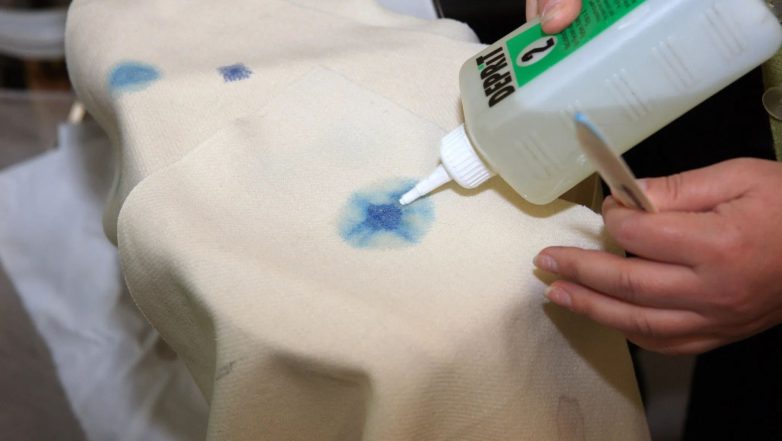 Прежде чем перейти к применению того или иного способа, протестируйте его на малозаметном участке одежды. Например, с изнанки или на внутреннем шве. Так можно выяснить, насколько он эффективен и безопасен (ткань не должна потерять цвет или повредиться). Что касается засохших пятен, то их не стоит сразу заливать растворителем. Для начала попробуйте убрать их механическим способом. Аккуратно поскребите ножом, ногтем или жёсткой щёткой. Часть краски осыплется, и оставшийся след будет намного проще вывести. Ещё один важный момент, если испачканная вещь дорогая или выполнена из деликатной ткани шёлк, шерсть, кожа, замша, кашемир и т.д.), не экспериментируйте дома. Самый надёжный и эффективный вариант – отнести одежду в химчистку. Там специалисту подберут подходящий способ и щадящие средства, чтобы вернуть вещи первоначальный вид без риска испортить её.