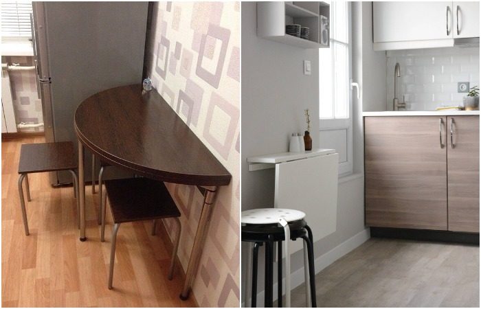 Кстати, стулья тоже можно купить складные, и по окончании трапезы убирать их на балкон либо вешать на крючок. Вам кажется, что они будут неудобными? Тогда обратите внимание на табуреты, которые можно поставить друг на друга или спрятать под стол. Еще один отличный вариант экономии пространства.