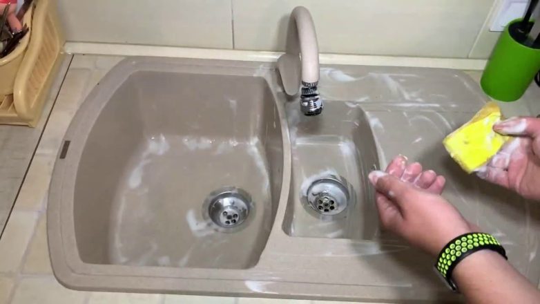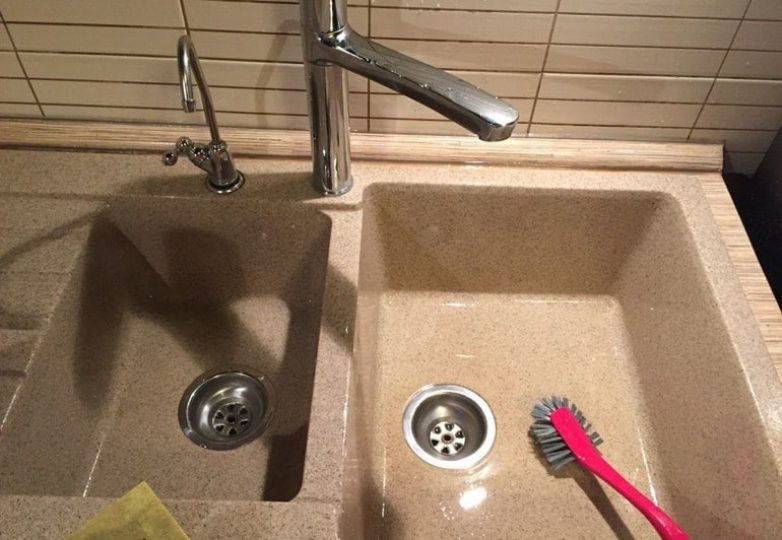Если чувствуете, что поверхность мойки или столешницы стала скользкой или маслянистой на ощупь, значит, пришло время заняться чисткой. Со временем на искусственном камне скапливается жир, особенно если рядом часто готовят и моют посуду. Если жирный налёт появился относительно недавно, справится с ним будет несложно. Достаточно кухонной губки и средства для мытья посуды. Намыльте поверхность, оставьте пену на несколько минут, чтобы средство успело растворить жир, затем тщательно смойте налёт тёплой водой. Остатки жира и грязи легко уйдут в слив, а поверхность вновь станет чистой и гладкой.