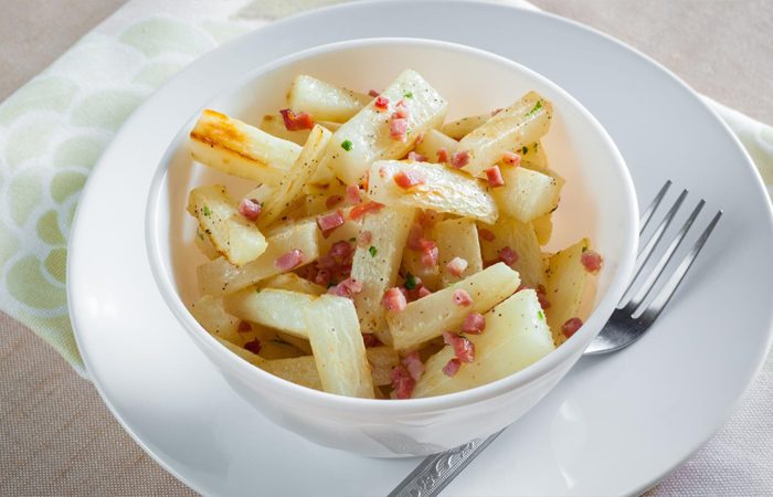 В сыром виде корнеплод сохраняет максимальное количество витаминов и микроэлементов. Из него можно приготовить салаты в азиатском стиле, закуску или просто нарезать кружочками или полосками, а затем приправить растительным маслом и специями.