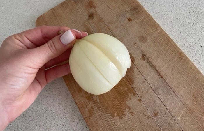 Дело в том, что большинство из нас нарезают лук пополам, потом еще раз и делают продольные надрезы. И приступают к нарезке кубиками. Это занимает много времени и, по сути, бесполезно, ведь луковица внутри и так разделена на слои. Гораздо быстрее взять целую луковицу и сделать продольные надрезы сверху вниз, после чего повернуть ее на бок и нарезать кубики.