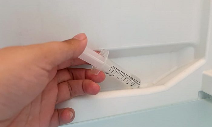 • Если проблема все равно осталась, нужно подключать тяжелую артиллерию. Возьмите обычный медицинский шприц, снимите с него углу и наберите теплую воду. Вставьте носик в отверстие и резким движением выдавите воду. Повторите процедуру несколько раз, чтобы вода протолкнула загрязнения внутрь по сливной трубке.