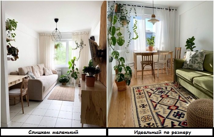 Если вы купите слишком маленькое изделие, между ним и мебелью появится дисбаланс. Кроме того, у гостей может сложиться ощущение, что у вас просто не хватило денег на полноценный ковер. Но это не значит, что нужно брать огромное изделие на всю комнату – так вы зрительно уменьшите пространство. Так что же делать? Как добиться золотой середины?