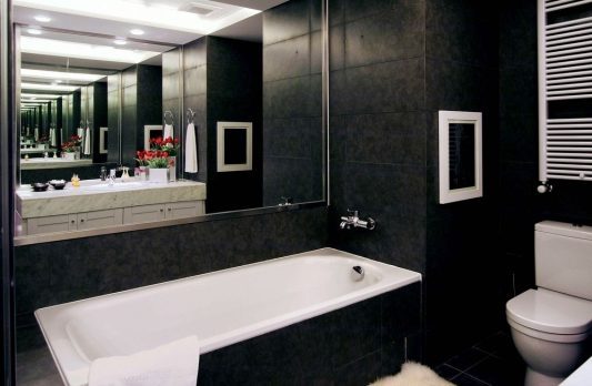 Как бы стильно не смотрелись ванные комнаты, оформленные в черном цвете, следует понимать, что это не вариант для крошечных помещений. Из-за темной плитки помещение будет казаться очень тесным и мрачным.