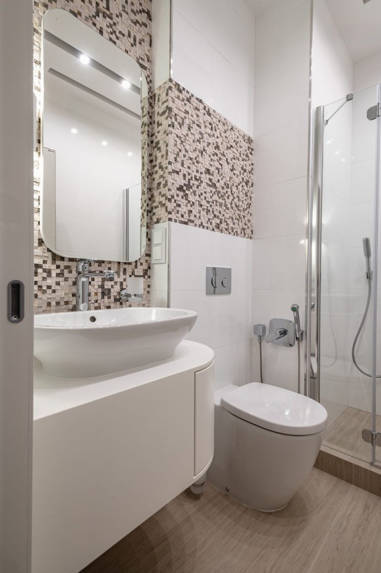 Маленькая плитка сделает ванную комнату еще более тесной и неуютной. Оптимальный вариант для небольших площадей — использование большой и широкой плитки, которая визуально увеличит помещение.