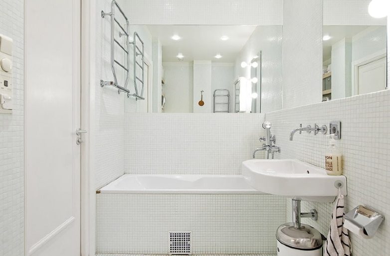 Белая сантехника, белый пол, белый потолок, белые стены — это слишком для маленькой ванной. Отдавайте предпочтение светлым тонам, которые помогут визуально расширить ванную. Но не забывайте об акцентных деталях, которые сделают помещение более стильным и уютным.