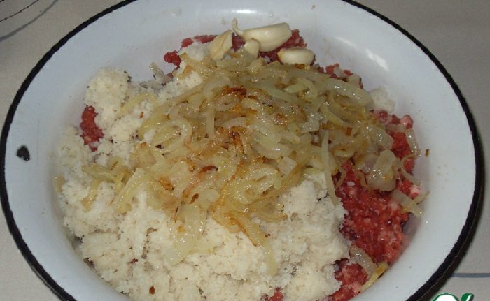 Сначала обжарьте лук, а затем добавляйте в фарш