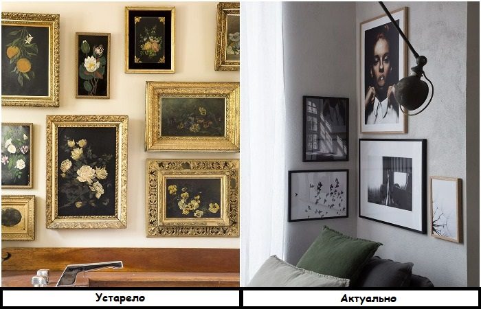 Роскошные золоченные рамы, которые раньше были в моде, постепенно уходят в прошлое. Да, в классических интерьерах еще можно встретить целые галереи, оформленные таким образом, но если вы хотите, чтобы интерьер шел в ногу со временем, откажитесь от подобных рам. Выбирайте нейтральные варианты, например, черные, белые или деревянные.