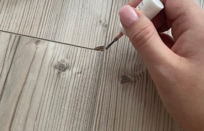 Чтобы скрыть сколы и трещины на ламинате, вовсе не стоит бежать в строительный магазин. Лучше загляните в свою косметичку. Там наверняка найдется обычный прозрачный лак для ногтей. Им то и следует покрыть трещину. Это поможет быстро и легко скрыть несовершенство вашего напольного покрытия.