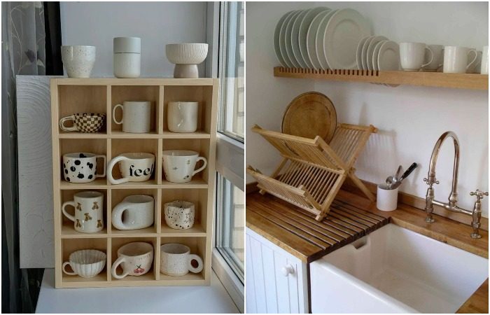 Обратите внимание, что для открытого хранения нужно выбирать эстетичные изделия. И это касается не только самих подставок (отлично смотрятся деревянные), но и посуды. Держите на виду красивые кружки и тарелки, которые по цвету или стилю будут вписываться в интерьер. Тогда они превратятся в прекрасный элемент декора, который украсит кухню.