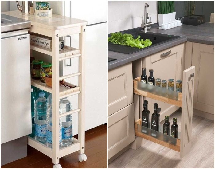 Если вы не подумали о такой секции еще на этапе планировки кухни, ничего страшного – в магазинах вполне можно найти готовые модули небольшой ширины, которые потом вы установите между стеной и кухонным гарнитуром или в другом пустующем месте.