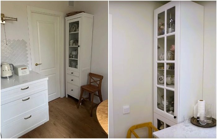 Если вы живете в типовой квартире, то вход на кухню наверняка расположен таким образом, что с одной стороны остается всего 20-30 сантиметров. Многие игнорируют это пространство, считая, что его никак нельзя использовать, но на самом деле варианты есть. Если вам катастрофически не хватает места для хранения, установите в этой зоне узкий неглубокий пенал с витриной и ящиками.