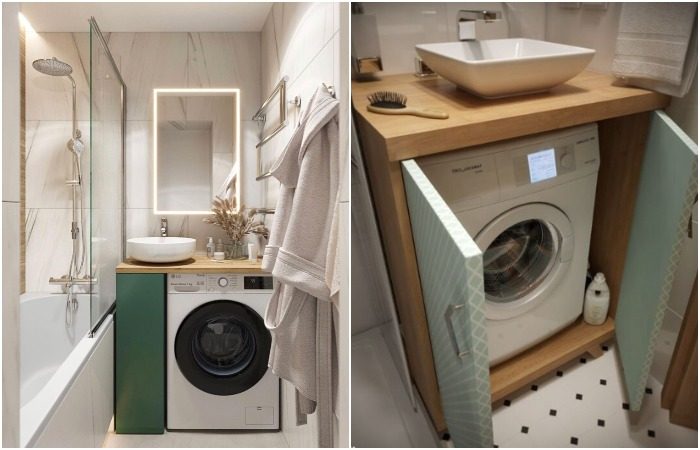 Самый простой вариант, который поможет сэкономить ценные метры – установить прибор под раковину, где она никому не будет мешать, но при этом без проблем справится со своими задачами. Однако здесь важно все рассчитать – высоту, ширину, глубину барабана. Также не забывайте, что для установки над стиральной машиной нужна специальная раковина, в которой сифон находится в задней части.