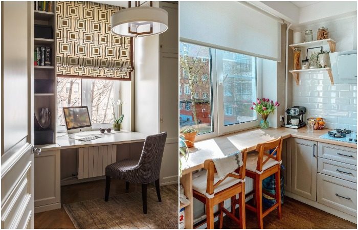 Если у вас маленькая кухня, увеличьте рабочую площадь за счет подоконника. Объедините его с кухонной столешницей или просто расширьте и используйте в качестве полки. На подоконник можно поставить микроволновку, мультиварку, чайник, кофеварку и прочую бытовую технику, а под ним организовать дополнительное место для хранения (если, конечно, там нет радиатора отопления).