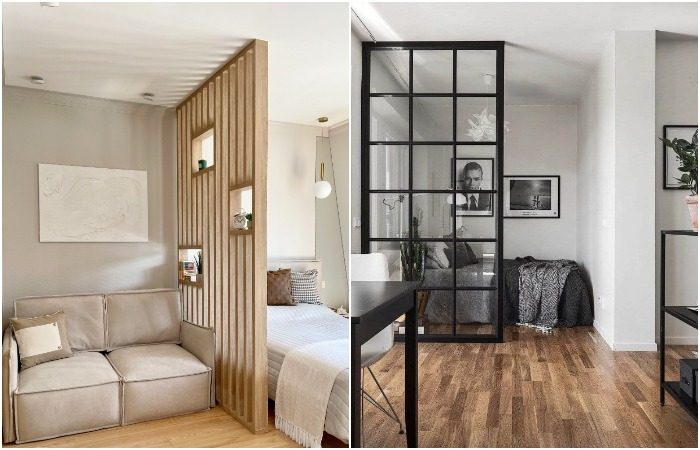 Чтобы чувствовать себя комфортно в квартире-студии, важно грамотно разделить ее зоны. Рабочее место, спальня, зона отдыха – это все будет находиться в одной комнате, поэтому нужно сделать так, чтобы и визуально, и физически они были отделены друг от друга. Самый популярный способ зонирования – перегородки.