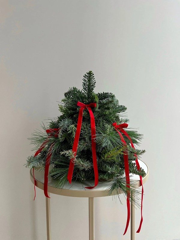 Хит сезона – маленькие елочки из разных хвойных веток. Бонус: банты вместо традиционных игрушек. Это главный тренд Нового года 2026, который уже захватил Pinterest. Поставьте их на рабочий стол, тумбу или прикроватную полку.