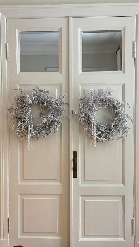 Белый венок с жемчугом – для тех кто устал от классических еловых веток. Такой декор добавляет роскоши и делает новогодний интерьер чуточку нежным. Повесить его можно не только на входную дверь, но и на зеркало, например.