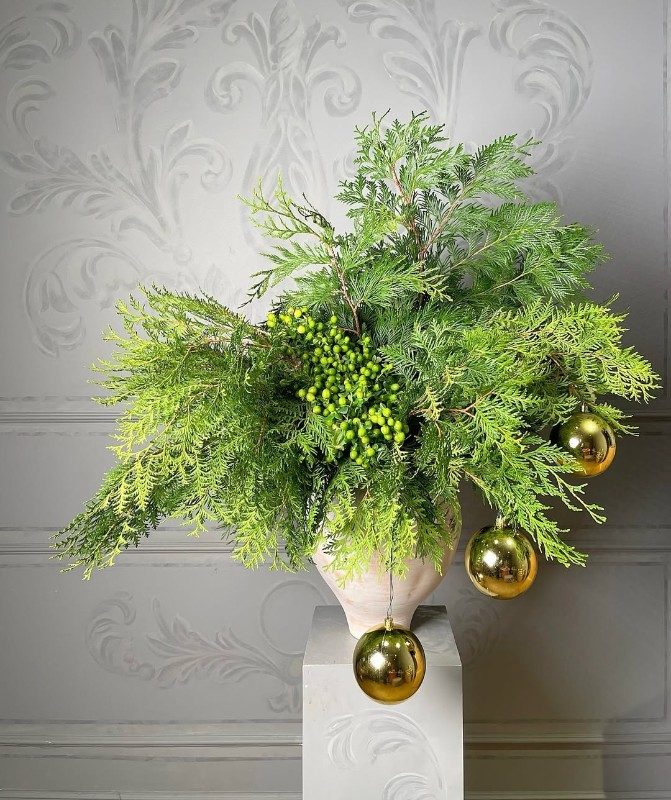Ветки кипариса – минималистичный, но очень эффектный вариант. Можно добавить золотые шары или гирлянду, чтобы поймать новогодний вайб. Отлично смотрится на подоконниках, консольных столах или рядом с диваном.