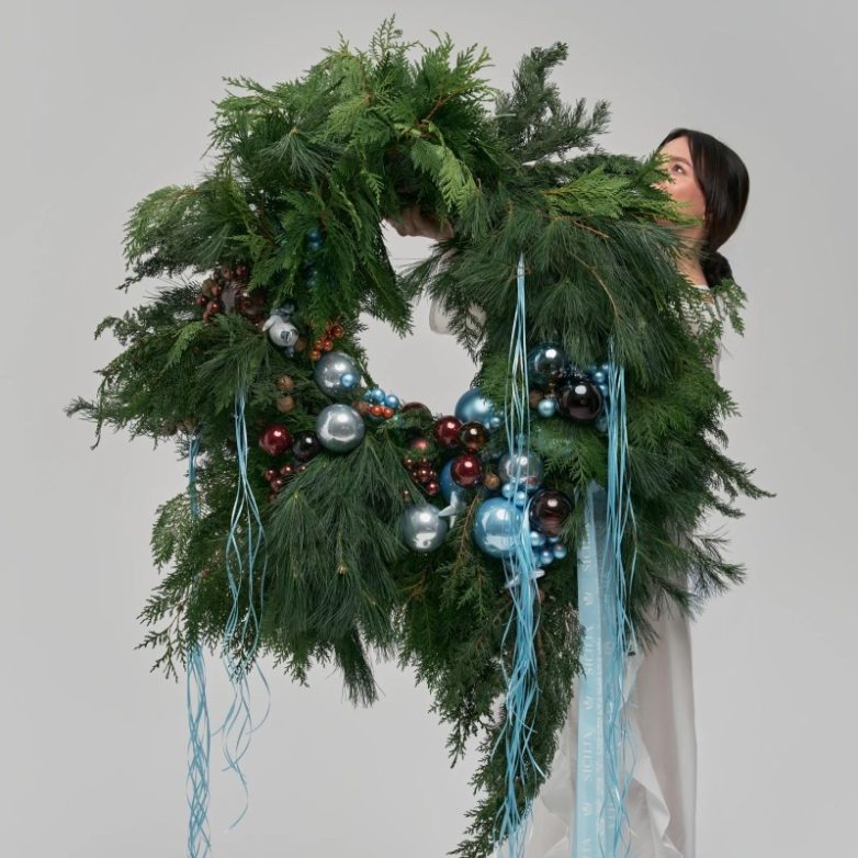 «Громкий» декор, который точно не останется незамеченным. Смешайте разные хвойные ветки, добавьте крупные шары – и получите стильный акцент. Не ограничивайтесь дверью: повесьте его на стену, над камином или поставьте на стол в центре.