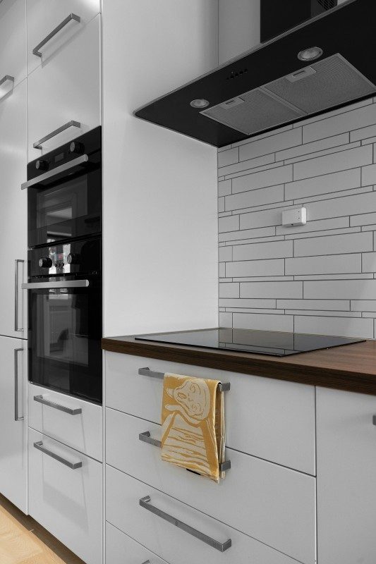 Сахар в пластиковом пакете, макароны в разорванной коробке и специи в разномастных баночках убивают эстетику. Решение – одинаковые стеклянные или керамические контейнеры.10. Старая вытяжка с пожелтевшим пластиком