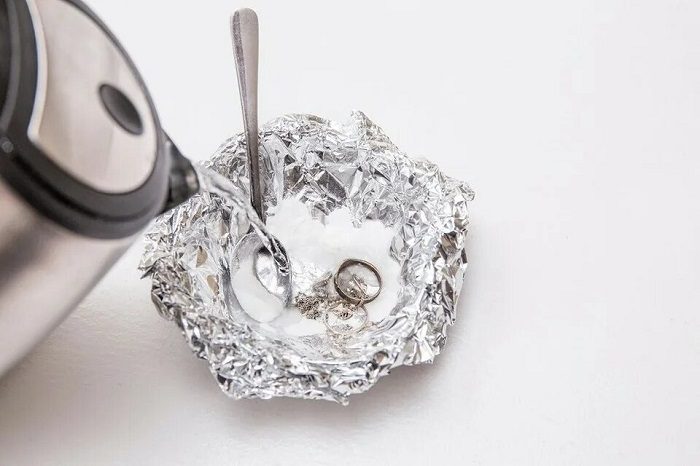 Вам понадобится алюминиевая фольга, сода и соль. Для начала нужно помыть изделия в теплом мыльном растворе, ополоснуть их и насухо протереть мягкой тканью. Далее поместите украшения в глубокую стеклянную миску, дно которой укрыто фольгой. Аккуратно расправьте их таким образом, чтобы они не лежали горкой, а равномерно распределялись по всей поверхности.