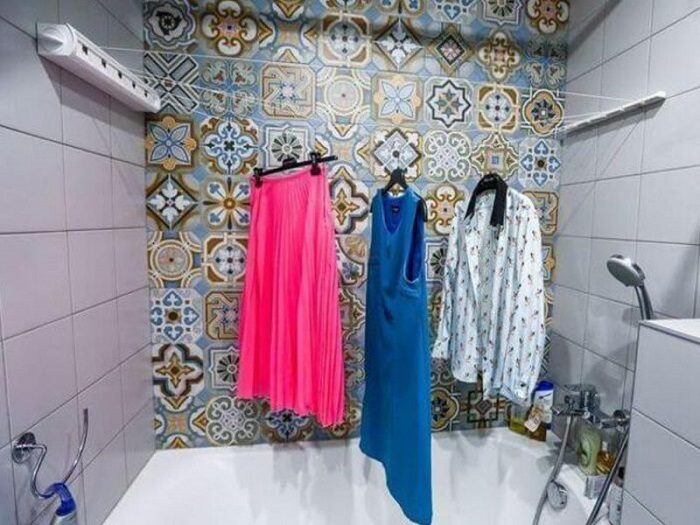 Развесьте мятую одежду на вешалке, отнесите в ванную комнату, поместите на рейку для душевой шторки и включите горячую воду. Пар слегка намочит ткань и складки разгладятся под собственным весом. Не переживайте, одежда намокнет лишь слегка, и пока вы будете собираться на работу или свидание, она успеет высохнуть. Кстати, вы можете совместить приятное с полезным и «гладить» вещи как раз в то время, пока будете принимать душ.