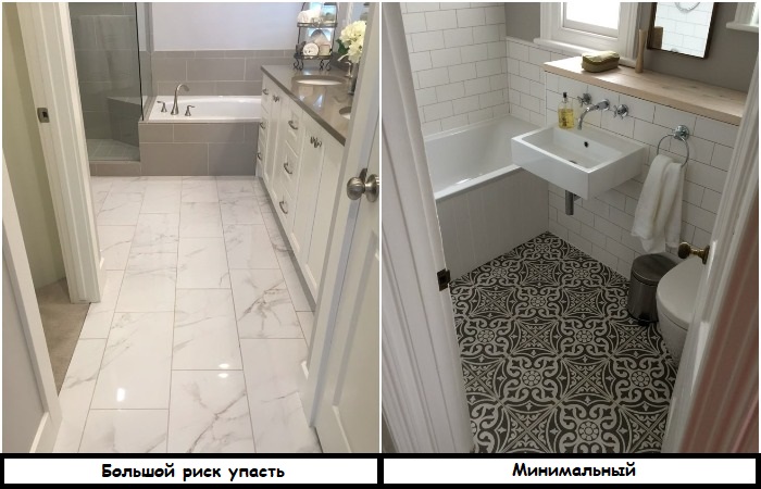 При выборе плитки для отделки пола важно обращать внимание не столько на дизайн и размер, сколько на ее травмоопасность. Материал не должен быть скользким ни в сухом, ни в мокром виде, иначе есть риск упасть и получить ушиб (или даже перелом). Чаще всего такими характерными особенностями «грешит» глянцевая плитка. Она очень сильно скользит, даже когда вы просто заходите в ванную, чтобы почистить зубы, не говоря уже о ситуации, когда принимаете душ или ванну.