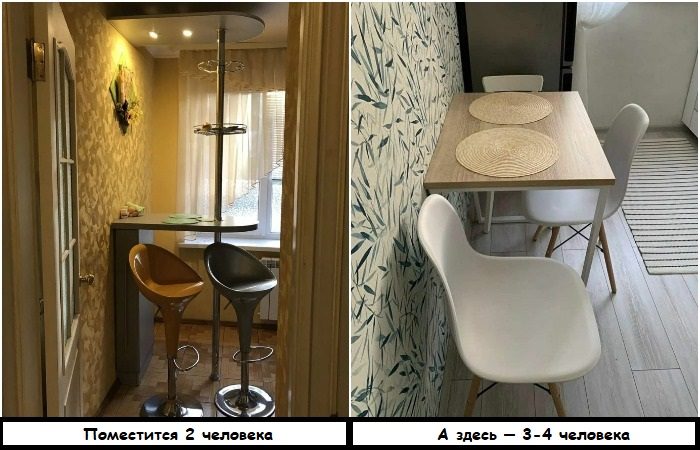 Вместо стойки лучше установить небольшой раскладной или откидной стол стандартной высоты. Стулья также могут быть раскладными. Еще один вариант – купить компактные табуреты, которые с легкостью получится убрать под стол, когда они будут не нужны. Или же есть модели, которые собираются друг в друга и формируют большой пуф. В общем, идей масса – выбирайте то, что подходит конкретно для вашей кухни.
