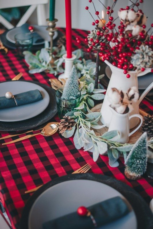 Для тех, кто устал от традиционного новогоднего декора, подойдет минималистичный сценарий. Белая или светло-серая посуда, прозрачное стекло, простые формы – и один выразительный цвет.