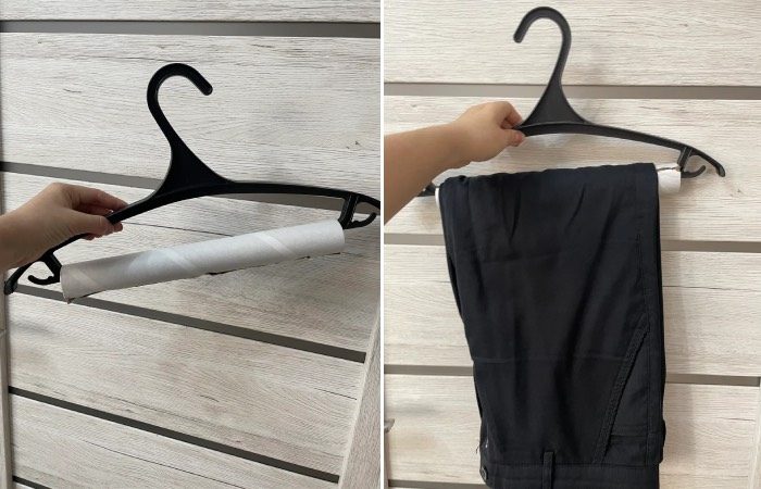 Чтобы избежать заломов от вешалки, необходимо ее модернизировать. Для это берем две втулки от бумажных полотенец. К счастью, сейчас легко можно найти их дома. На втулке необходимо сделать продольный надрез. После чего просто наденьте ее на нижнюю перекладину вешалки. Таким образом, вы получите вешалку с закругленной перекладиной. А значит, никаких больше заломов на брюках.