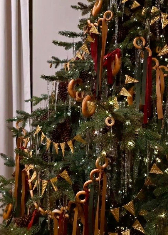 Сушки, баранки, бублики – это не только про эстетику, но и про настроение. Они добавляют уют, ту самую «русскую народную» эстетику, которую сложно повторить пластиком или стеклом. Подвешивать их лучше на тонкие ленты – так они выглядят аккуратно и структурно. А можно даже сделать гирлянду из нескольких бубликов.