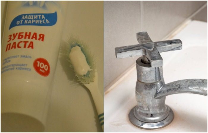 Чтобы их устранить, необязательно использовать специальную бытовую химию – есть много подручных средств, которые справятся с этой задачей не хуже. Например, китаянки используют зубную пасту. Нужно нанести небольшое количество на загрязненные участки и аккуратно почистить мягкой зубной щеткой. Если известковый налет свежий, подойдет и обычная губка для посуды. Старайтесь не использовать инструменты с абразивным покрытием, чтобы не повредить сантехнику.