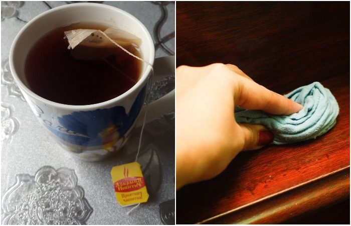 Они берут глубокую миску, кладут в нее несколько пакетиков чая, заливают кипятком и ждут, пока получится крепкая заварка. После этого нужно смочить в ней тряпку и протереть мебель. Напиток маскирует царапины, возвращает деревянным изделиям сияние и придает чудесный аромат.