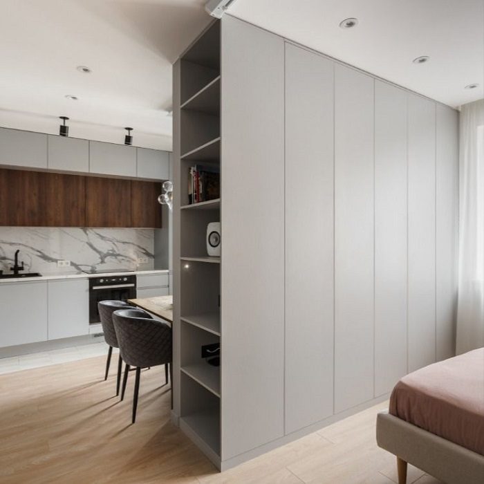 А это решение будет актуальным для студии или кухни-гостиной, где нужно разделить комнату на функциональные зоны. Обычно для зонирования используют реечные панели, стеклянную перегородку, штору или ширму, но если не хватает мест для хранения, лучше отдать предпочтение шкафу. Будьте готовы к тому, что его придется делать на заказ в соответствии с планировкой вашей гостиной. Советуем сразу предусмотреть наличие ящиков, открытых полок и вертикальных секций, где можно будет хранить одежду на плечиках.