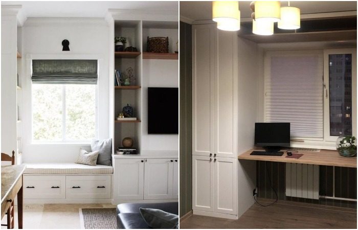 • Установить стеллаж или шкаф вокруг окна. Если хотите, чтобы эта зона казалась легкой и воздушной, оставьте полки открытыми. Но в этом случае нужно будет тщательно продумать их содержимое и постоянно поддерживать порядок. Если же вы за практичность и удобство в уборке, тогда сделайте шкаф с дверцами. А чтобы они не выглядели массивно, выберите не глухие фасады, а изделия из матового стекла.