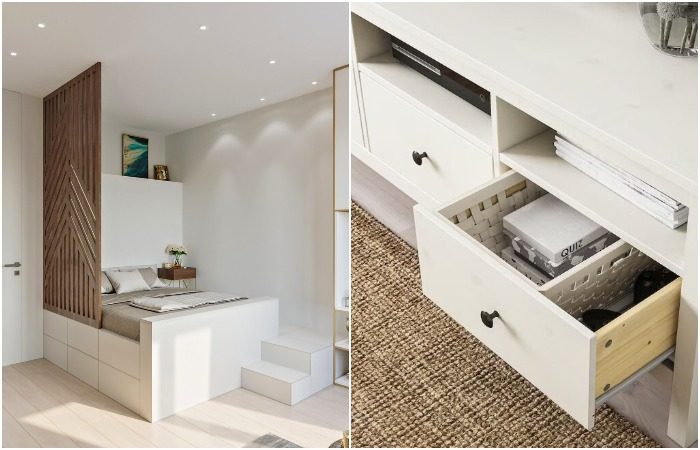 По словам дизайнеров, самым практичным способом хранения являются закрытые ящики. Они позволяют удобно сортировать вещи, избавляют от визуального шума, к тому же для них можно найти место даже в небольшой квартире.