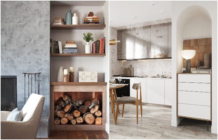 Сделайте в нише полки с камином или поставьте комод