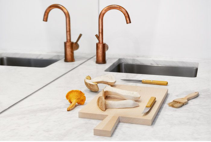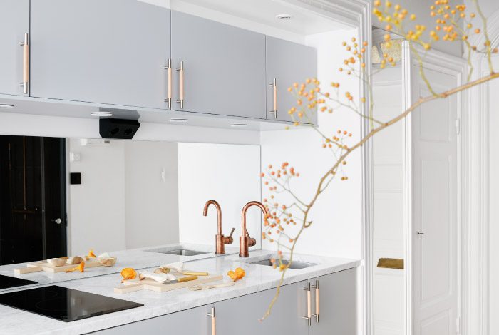 Сразу у входа в квартиру у одной из стен расположена стильная зона кухни. Она сразу цепляет глаз, тут действительно есть, на что посмотреть. Интерьер этого уголка оформлен в элегантном лаконичном стиле. Серебристый кухонный гарнитур, медная сантехника, мраморная столешница – все эти элементы указывают на утончённый вкус хозяев квартиры. А вместо кухонного фартука тут установили зеркало, которое зрительно здорово увеличивает пространства.