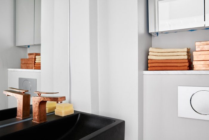 Санузел в этой малогабаритке совсем небольшой, но несмотря на это, его интерьер нельзя назвать скучным или стандартным по дизайну. Он облицован крупной матовой плиткой чёрного цвета, что совсем не свойственно для комнат такой конфигурации. Но как же здорово тут смотрится сочетание тёмной отделки и медной сантехники – вершина стиля!