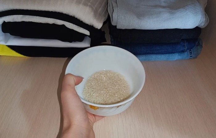 Речь идет о миске с рисом. Именно ее следует поместить в шкаф. Если ваш гардероб достаточно большой, то лучше взять пару мисок с рисом. Эта крупа удивительным образом впитает излишки влаги и поглотит неприятные запахи. И уже после этого вы можете размещать в шкафу натуральные ароматизаторы.