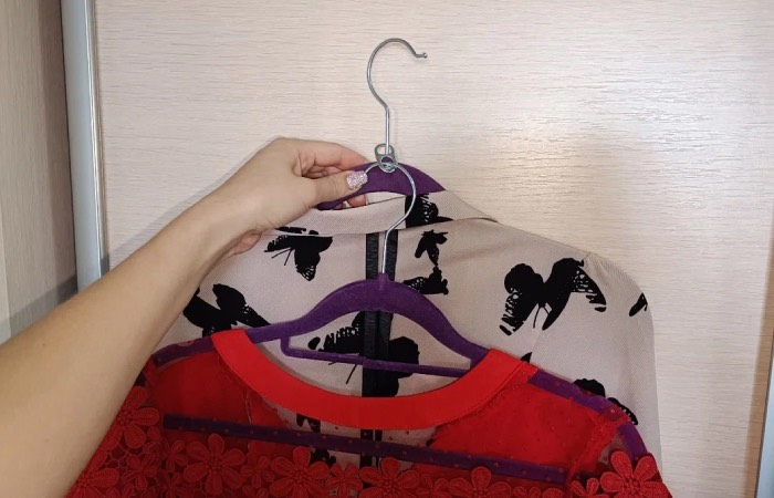 Если у вас в шкафу не очень много места для вешалок, то вам точно понравится наш совет. Ведь всем известно, что вещи лучше всего вешать на вешалки, а не складывать в стопки. Так вот, для того, чтобы все ваши вешалки влезли в шкаф, нам и понадобится кольцо от банки. Просто наденьте кольцо на крючок вешалки, а во второе отверстие проденьте вторую вешалку. Таким образом, вы сможете повесить вдвое больше нарядов даже в узкий шкаф.