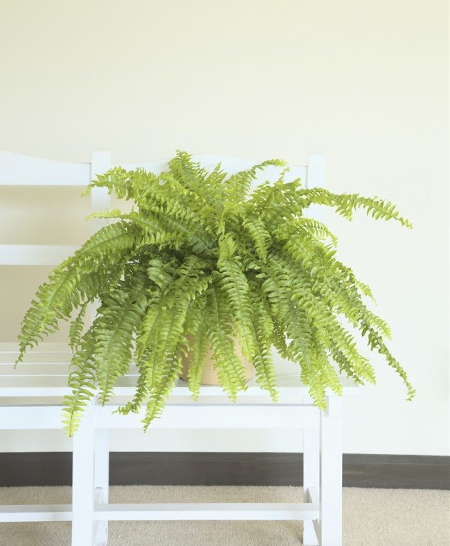 Папоротник увлажняет и очищает воздух от испарений формальдегида, угарного газа и ксилола. Обожает регулярный полив и тень.