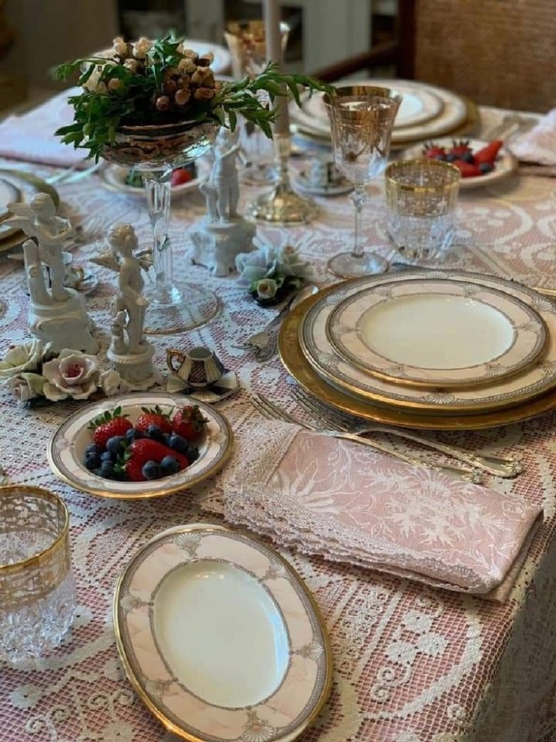 Совсем не обязательно полностью выставлять бабушкин фарфоровый сервиз и такой трендовый сейчас хрусталь. Гораздо интересней будет сделать микс в стиле Mix&Match с современной минималистичной посудой. Можно добавить декор, соответствующий нашему времени, и при этом дополнить старинной кружевной скатертью.
