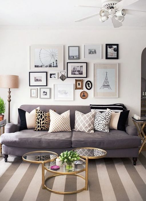 В небольшой гостиной даже декор выполняет практичную функцию. Так, постеры и фото над диваном способны визуально сделать комнату пропорциональной и подарить пространству перспективу.
