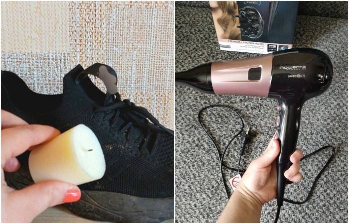 Также можно сделать обувь влагостойкой с помощью обычного парафина. Не нужно ничего растапливать или проводить какие-то предварительные мероприятия. Просто возьмите свечу и тщательно обработайте ею всю поверхность ботинок, в том числе стыки и швы. Далее возьмите фен, включите его на полную мощность и прогрейте обувь по всей площади. Во время процедуры парафин начнет плавиться – это нормально. Благодаря этому он быстрее впитается в материал обуви. Вуаля – теперь вашим любимым ботинкам не страшны лужи и снег, они останутся сухими.