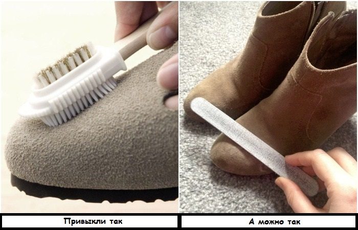 Возьмите пилочку для ногтей и аккуратно пройдитесь по всей поверхности сапог. Она аккуратно устранит все несовершенства, в том числе грязь, и вам останется лишь протереть замшу влажной салфеткой.
