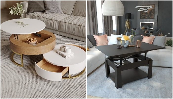 Начать можно с журнального столика, который превращается в полноценный обеденный стол. Это актуально, если на кухне для него не хватает места. Если же обеденная зона уже организована, тогда присмотритесь к журнальному столику с полкой или глубоким отсеком внизу. Туда можно будет убирать книги, журналы, пульт от телевизора, плед, настольные игры и пр.