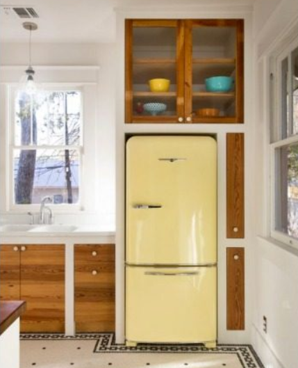 Как насчет того, чтобы установить холодильник в специальный короб с верхним шкафчиком, где можно будет хранить текстиль, запасы продуктов, праздничную посуду и прочее? А в торце можно повесить рейлинг для хранения полотенец, прихваток или, например, лопаток.