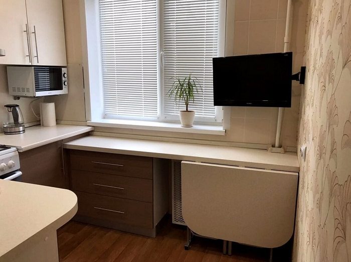 Стол прячется под подоконником.