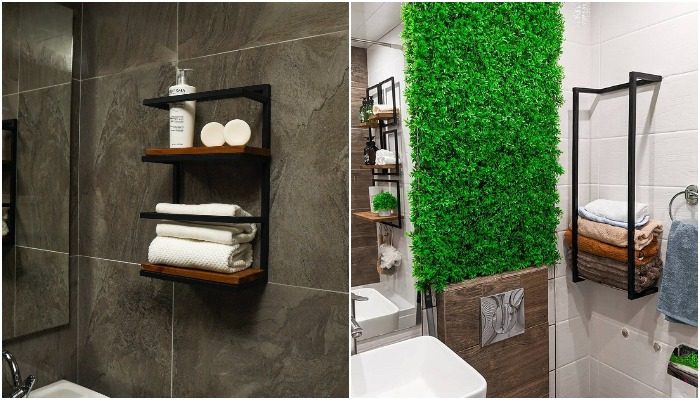 Чтобы не вешать их на крючки и не провоцировать визуальный шум, можно установить на стене специальную подвесную секцию, как на фото выше. Выбирайте контрастное изделие или модель, которая будет совпадать по цвету со стенами. Положите внутрь полотенца для рук и тела, а также банные халаты – в таких секциях достаточно места. Вуаля – одним движением вы разгрузили тумбу, в которую теперь можно перенести стайлинговые средства, бытовую химию, уходовую косметику и пр.